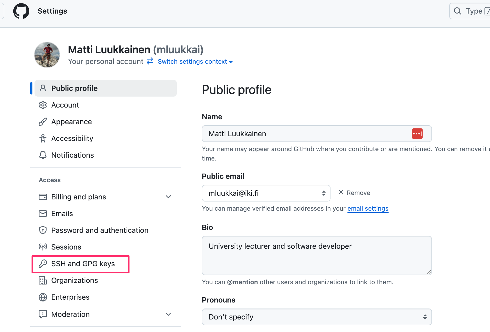 - Mene GitHubin asetussivulle klikkaamalla oikean yläkulman symbolista ja valitsemalla Settings