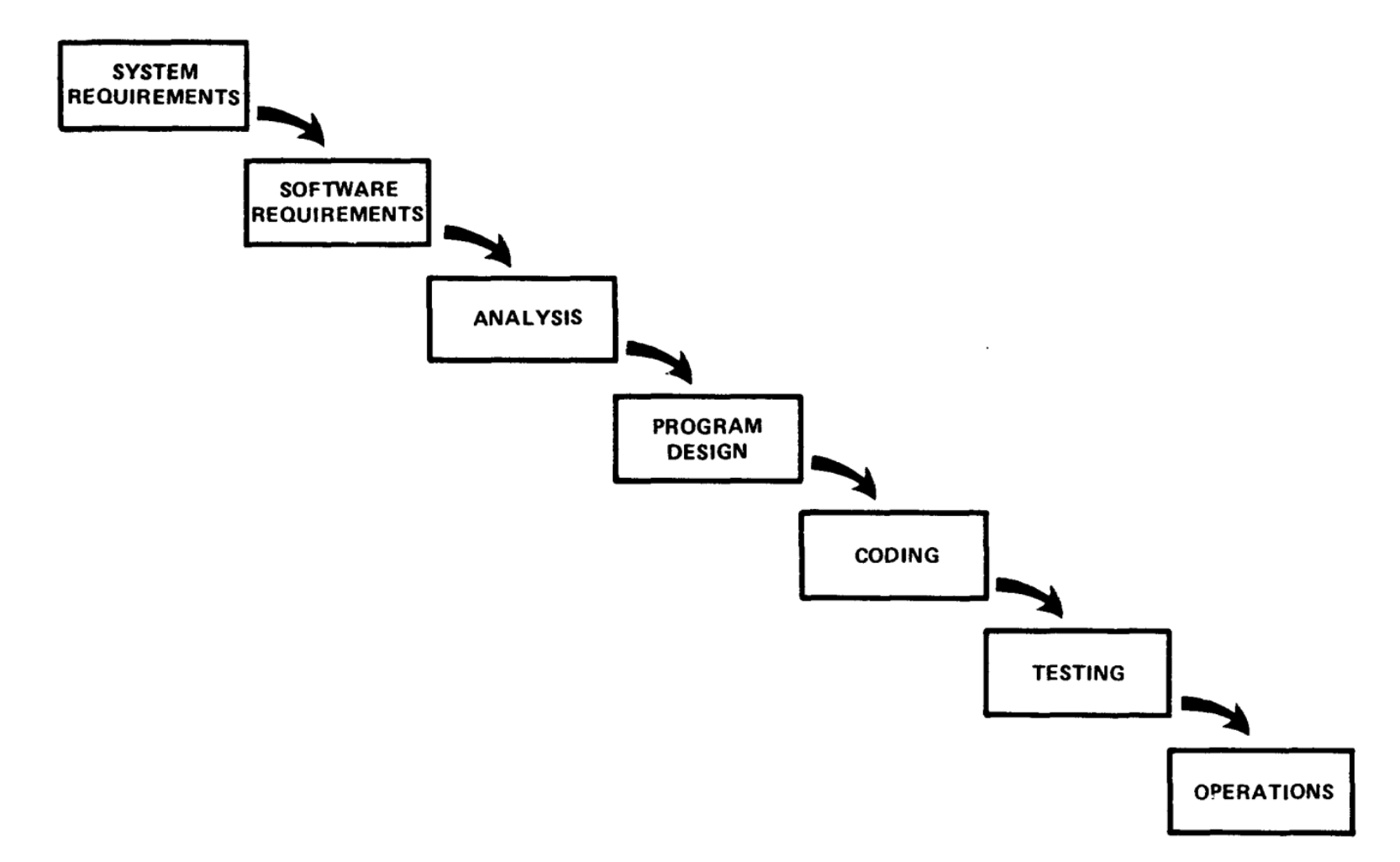 Winston Roycen vuonna 1970 julkaisema artikkeli Management of the development of Large Software pohdiskelee isojen ohjelmistojen kehittämiseen liittyvää problematiikkaa. Artikkelin sivulla 2 Royce esittelee yksinkertaisen prosessimallin (eli ohjeiston työvaiheiden jaksottamiseen), jossa ohjelmiston elinkaaren vaiheet suoritetaan lineaarisesti peräkkäin: