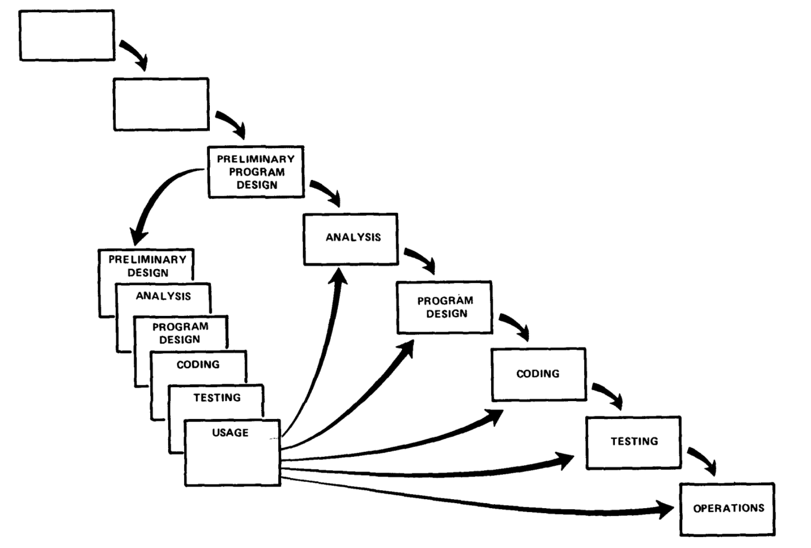 Vesiputousmallin “isä” Royce suositteli siis jo vuonna 1970 juurikin iteratiivista tapaa (kahden iteraation versiota) monimutkaisten ohjelmistojen kehitysmalliksi. Roycen ehdottama menetelmä ei oikeastaan ollut inkrementaalinen, sillä ensimmäisen iteraation aikana rakennettiin ainoastaan prototyyppi, jonka pohjalta varsinainen sovellus määriteltiin, suunniteltiin ja toteutettiin.