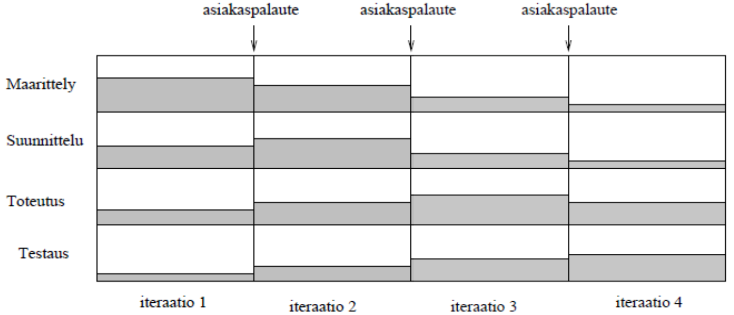 Seuraava kuva havainnollistaa sitä, että iteratiivisessa mallissa kaikkia ohjelmistoprosessin vaiheita suoritetaan jokaisessa iteraatiossa. Määrittelyllä ja suunnittelulla on alussa suurempi painoarvo, mutta ohjelmiston toteutus ja testaus alkaa jo ensimmäisten iteraatioiden aikana.