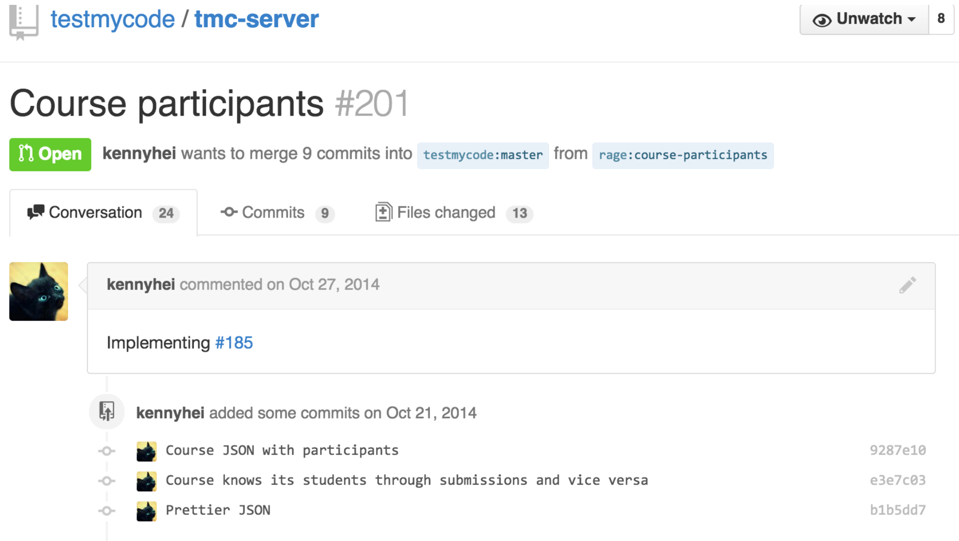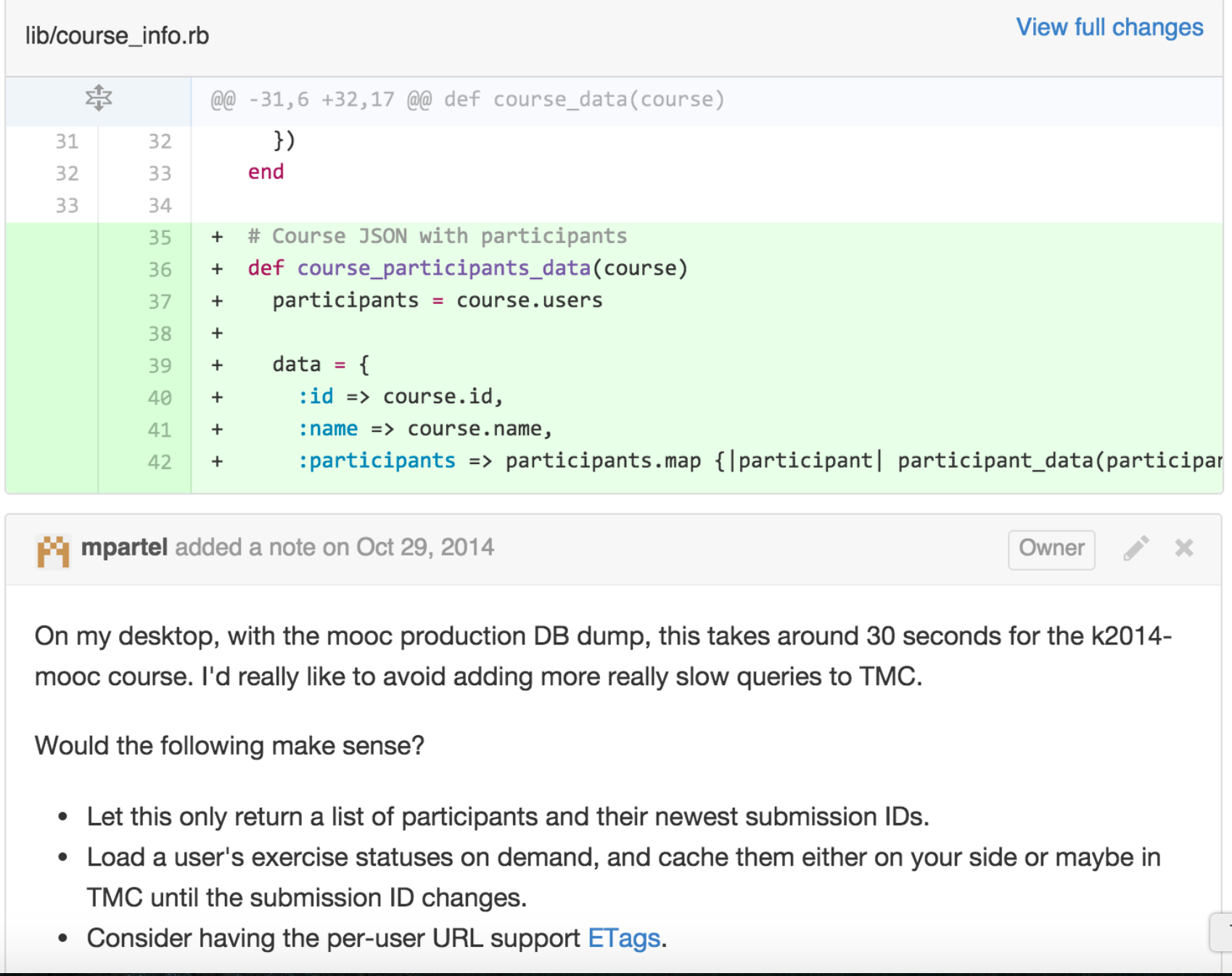 Seuraavassa esimerkki TMC-projektiin tehdystä pull requestista ja siihen liittyvistä kommenteista: