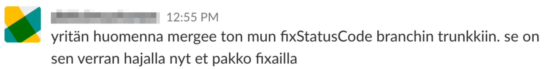TMC:n silloinen pääkehittäjä ei kuitenkaan hyväksy muutoksia vielä mergettäväksi, vaan antaa muutaman parannusehdotuksen sovelluskehittäjälle.