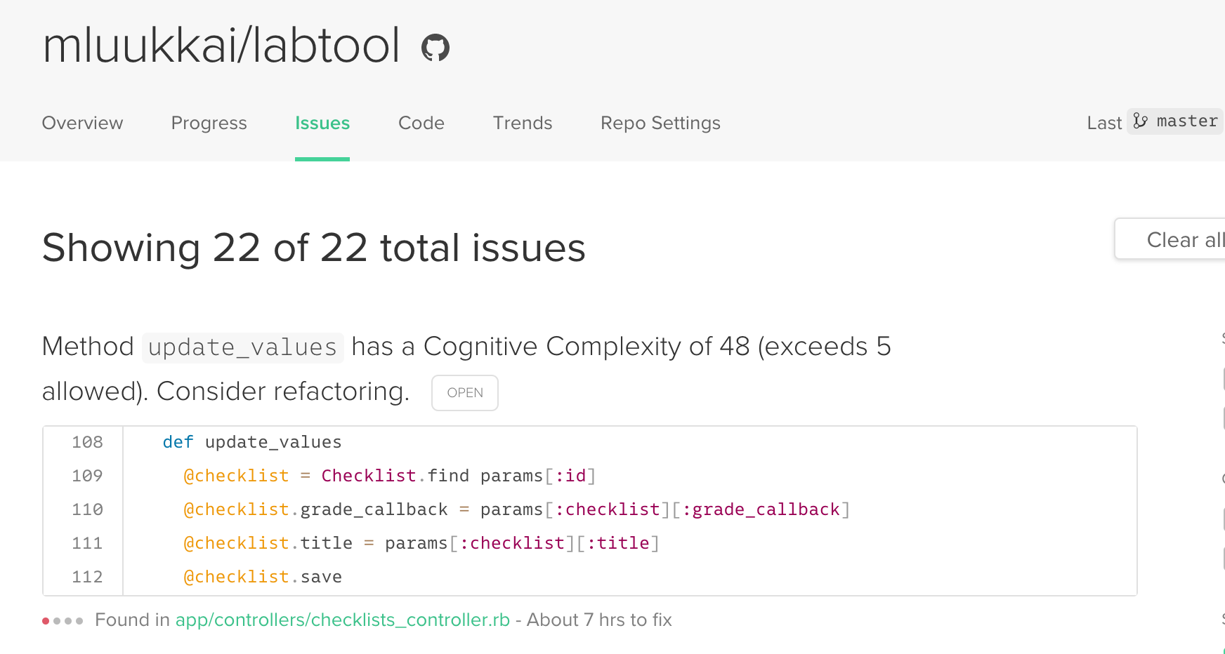 Laitoksen harjoitustyökursseilla käytettävän Labtoolin vanhan version Codeclimate-raportti kertoo, että koodista löytyy yhteensä 22 epäilyttävää kohtaa. Koodin laadun saama arvosana on C ja arvio sen siistimiseen kuluvasta ajasta on viikko: